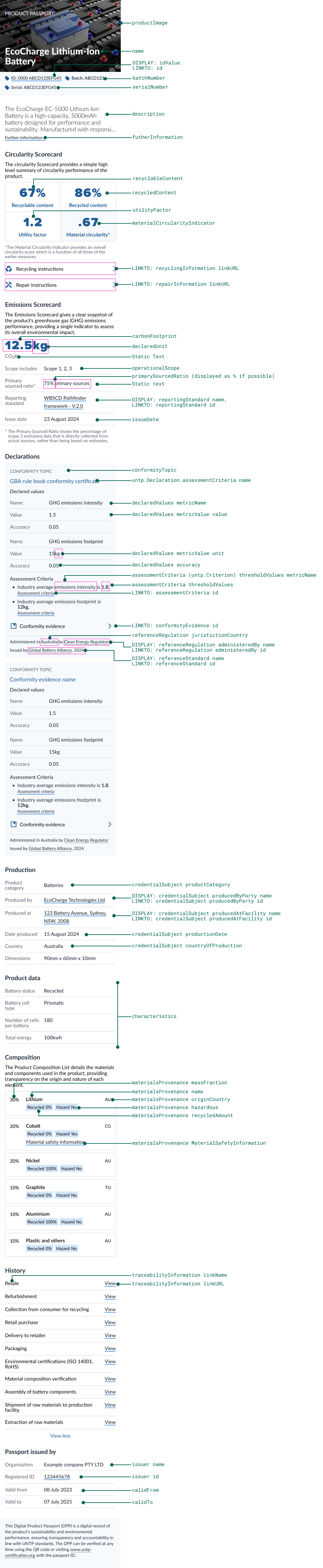 credentialSubjectis of typeProductPassport, which includes aproductattribute that contains the core product information (see the Product section below). granularityLevelindicates whether the DPP is issued at the product class level (e.g., all shoes of the same model), batch level, or serialised item level.dueDiligenceDeclarationis a link to a due diligence declaration that meets the legal requirements of the importing economy.materialsProvenanceis an array of UNTPMaterialtypes that define the origin and characteristics of constituent materials in the product.conformityClaimsis an array ofClaimtypes that list the product quality or sustainability claims made by the manufacturer against criteria defined by a reference standard or regulation. The sustainability vocabulary accommodates diverse conformity criteria expressed by various standards and regulations.circularityScorecardis a simple object that defines the overall percentage of recycled content (and recyclable content) as well as links to recycling and repair information.emissionsScorecarddefines the carbon footprint of the product against a defined reporting standard, the scope 3 boundaries, and the extent to which the data is accurately measured.traceabilityInformationis an array ofLinkobjects that reference UNTP Digital Traceability Events, providing traceability through the value chain via events such as theTransformationEventthat lists input and output product identifiers for a manufacturing process.